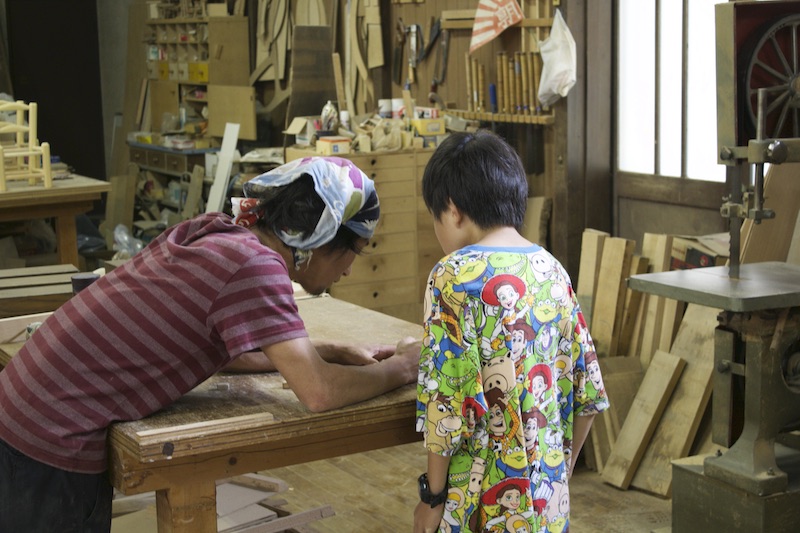 カフェのテーブルや椅子はすべてアーツ&クラフツビレッジの木工房で製作した作品です。